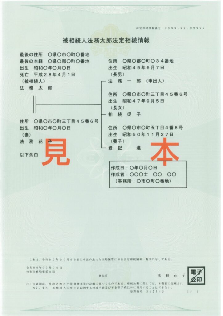 平成29年(2017年)5月29日から始まった制度で、相続関係を一覧に表した図(法定相続情報一覧図)とともに、戸除籍謄本等の束を登記所に提出し、一覧図の内容が民法に定められた相続関係と合致していることを登記官が確認した上で、その一覧図に認証文を付した写しを無料で交付するというものです。